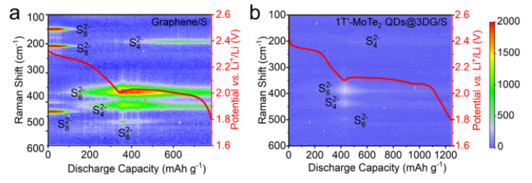 圖 5. (a) 石墨烯/S和 (b) MTQ@3DG/S電極在放電過程中的原位時間分辨微拉曼測量。