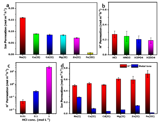-1,分離因子為141.2,說明酸回收的選擇性較高。研究結(jié)果表明,氧化石墨烯基膜從低濃度酸性水溶液中選擇性回收酸是可行的,并為構(gòu)建基于二維材料的選擇性分離膜提供了一種新的策略。