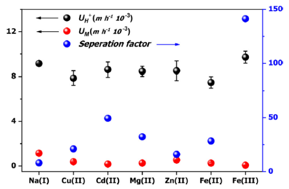 圖6 AGO-100膜從不同的HCl/金屬氯化物溶液中回收酸的透析系數(shù)(UH þ和UM)和分離系數(shù)(S)。
