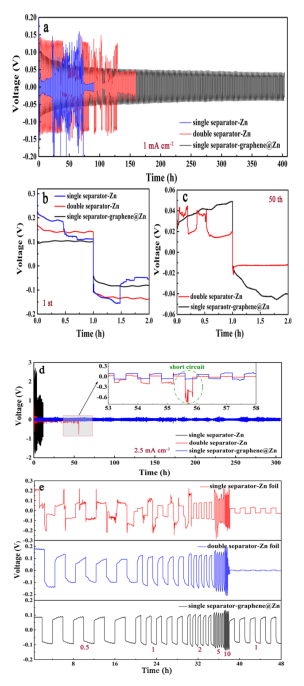圖2. 石墨烯@Zn和Zn對(duì)稱電池的電化學(xué)行為:(a)1 mA cm