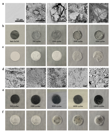 圖5. (a,b)鋅箔電極和(c)隔膜、(d,e)石墨烯@Zn電極和(f)隔膜的SEM和數(shù)字圖像。