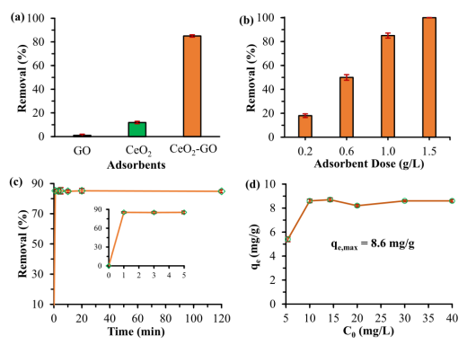 -/L(WHO 建議的飲用水限值),因此選擇了1 g/L作為最佳劑量;(c) 隨著時(shí)間的推移,GO-CeO