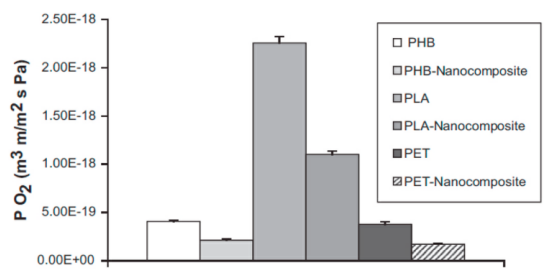 圖2. PLA、PHB和PET及其納米復合材料的透氧性