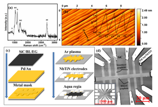 Figure 1. 器件的制造和光學特性。(a) EG/4H-SiC的拉曼光譜。(b)原子力顯微鏡圖像顯示了碳化硅襯底上乙二醇的均勻表面形貌。(c)無殘留物器件的制造工藝示意圖。(d)顯示了EG/4H-SiC基器件的共焦顯微圖像。
