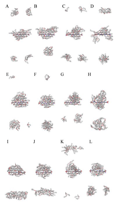 圖3. 在功能化石墨烯上DOP吸附的平衡構(gòu)型(A: GPE-1/MeOH-0%, B: GPE-1/MeOH-5%, C: GPE-1/MeOH-10%, D: GPE-1/MeOH-20%, E: GPE-2/MeOH-0%, F: GPE-2/MeOH-5%, G: GPE-2/MeOH-10%, H: GPE-2/MeOH-20%, I: GPE-3/MeOH-0%, J: GPE-3/MeOH-5%, K: GPE-3/MeOH-10%, L: GPE-3/MeOH-20%)。