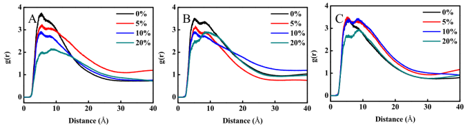 圖4. 在不同甲醇含量的溶劑中,吸附在不同功能化石墨烯模型上的DOP的徑向分布函數(shù)[g(r)](A:GPE-1,B: GPE-2,C: GPE3)。
