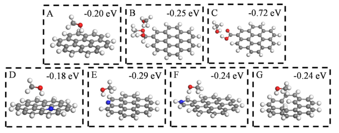 圖6.吸附在功能化石墨烯上的甲醇的平衡構(gòu)型和吸附能(A:石墨結(jié)構(gòu),B: –CO