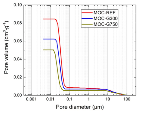 圖10. MOC-REF、MOC-G300和MOC-G750的累積孔容分布(14天試樣)。