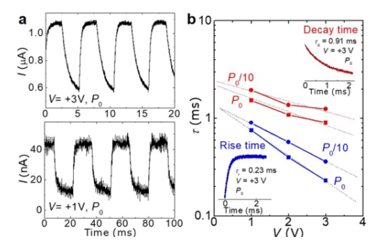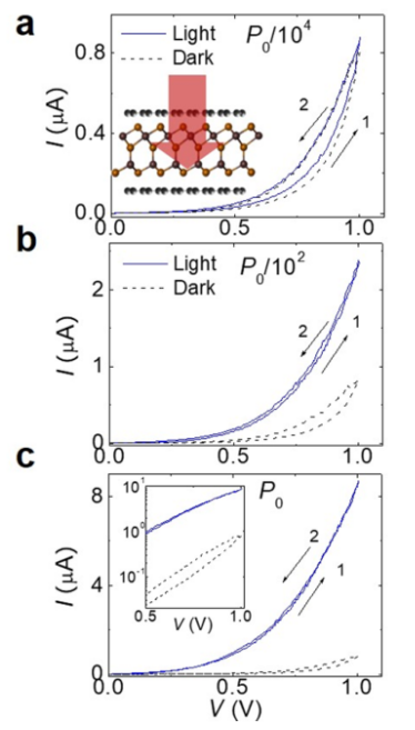 圖4. 鐵電半導體結的光響應。(a)、(b)不同功率P