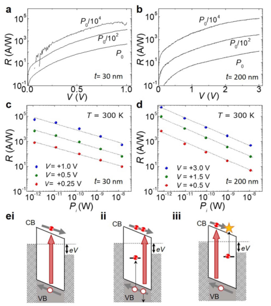 i下的光響應(R)與電壓(V)的關系,能量為hv=1.96 eV (λ=633 nm)的激光和30 nm (a)和200 nm (b)的FSJs(T = 300K)。(c), (d)電壓不同時的 R與P