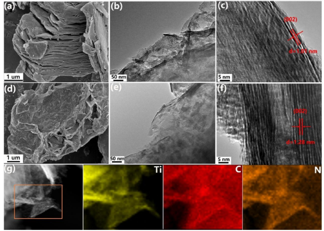 圖2 (a) SEM, (b) TEM, (c) HRTEM。(d) SEM, (e) TEM和(f) HRTEM圖像。(g) MA-Ti