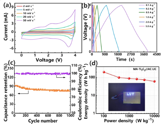 2//AC LICs的電化學(xué)性能。(a) CV曲線和(b)相同電位窗口0.01-4.0 v下的GCD曲線。(c)循環(huán)穩(wěn)定性和(d) Ragone曲線。