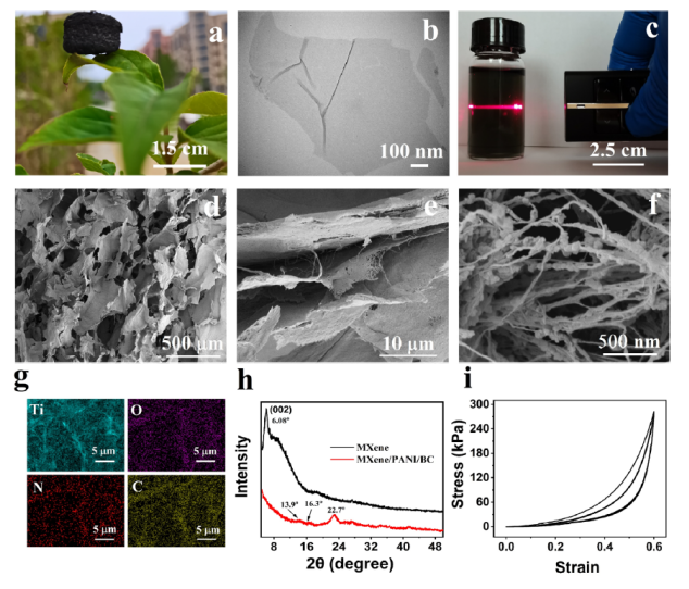 圖2 (a) MXene/PANI/BC氣凝膠質(zhì)量輕。(b)單層MXene的TEM圖像。(c)少層/單層MXene溶液產(chǎn)生的廷德爾效應(yīng)。(d-f)不同分辨率下MXene/PANI/BC氣凝膠的SEM圖像。(g) MXene/ PANI/BC氣凝膠的EDS圖像。(h) MXene和MXene/PANI/BC氣凝膠的XRD譜圖。(i) MXene/PANI/ BC氣凝膠連續(xù)五次壓縮試驗。