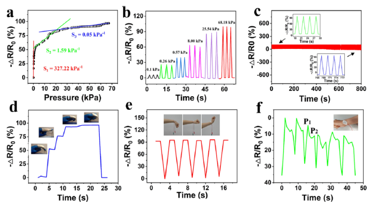 圖3 (a)相對電阻在壓力0 ~ 70 kPa范圍內(nèi)的變化。(b)加載卸載循環(huán)下不同壓力的重復傳感響應(yīng)。(c) 68.18 kPa壓力下的騎行耐久性。(d)手指彎曲傳感器的傳感響應(yīng)。插圖:安裝在不同彎曲角度的手指上的傳感器的光學圖像。(e)監(jiān)測手腕彎曲的傳感器響應(yīng)傳感。插入:安裝在手腕上的傳感器的光學圖像。(f)傳感器檢測手腕脈沖的傳感響應(yīng)。插入:安裝在手腕上的傳感器的光學圖像。