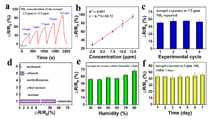 x MXene/PANI/BC復合氣凝膠氣體傳感器對實驗周期的定量響應(yīng)變化。(d) MXene/PANI/BC復合氣凝膠氣體傳感器的選擇性。(e)響應(yīng)與相對濕度的關(guān)系。(f) MXene/PANI/BC復合氣凝膠基氣體傳感器7天內(nèi)的穩(wěn)定性。