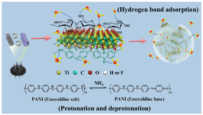 由碳材料制成的柔性壓力傳感器已經(jīng)應(yīng)用于電子皮膚(e-skin)中,如果采用復合傳感材料,其性能將得到提高。本文通過MXene與一維活性材料之間的自組裝過程,制備了MXene/聚苯胺/細菌纖維素(MXene/PANI/BC)氣凝膠傳感器。與更少層或單層的MXenes相結(jié)合,制成的氣凝膠可作為壓力傳感器的主動層,監(jiān)測手指彎曲、手腕彎曲和脈搏跳動等微小運動信號。藍牙無線傳輸還可以實時監(jiān)測手機上的空間壓力分布,使得基于氣凝膠的傳感器成為電子皮膚的理想選擇。與此同時,aerogel-based傳感器敏感對NH