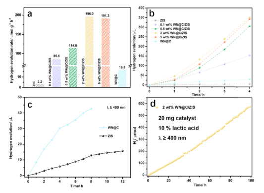 Figure 4.(a-b) ZIS、WN@C和不同負(fù)載量WN@C復(fù)合材料的性能比較。(c)光催化析氫的時(shí)間依賴性。(d) 2 wt% WN@C/ZIS在可見光照射下(λ≥400 nm)的光催化穩(wěn)定性。