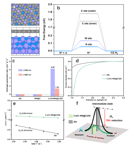 Figure 5. (a) WN@C界面模型的頂部和側(cè)視圖。(b)計(jì)算了WN@C不同位點(diǎn)上HER的吉布斯自由能圖。(c)不同催化劑在500 nm單色光照射下前2小時(shí)的平均光催化性能。(d) LSV圖。(e)對反應(yīng)速率的溫度依賴性。(f) 表觀活化能Ea差示意圖。