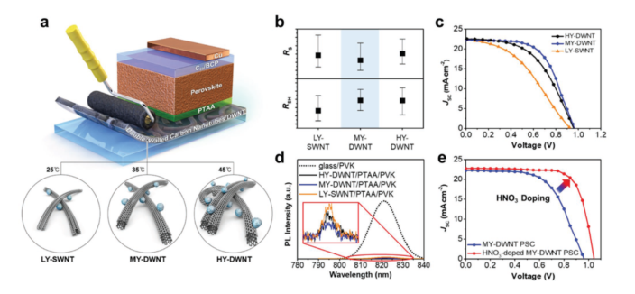 圖5 CNT TCFs在PSCs中的應(yīng)用。a)基于LY-SWNT TCF-、MY-DWNT TCF-和HY-DWNT TCF的PSCs三維示意圖。b)根據(jù)RS(上)和RSH(下)對(duì)CNTs基PSCs的比較。c) CNTs基PSCs的J-V曲線。d)鈣鈦礦薄膜(PVK)在不同碳納米管TCFs上的PL。e) HNO