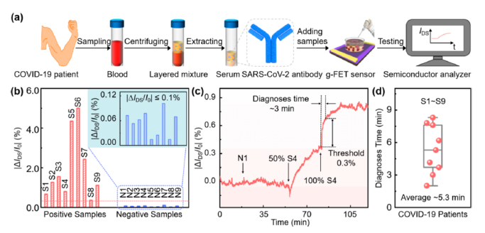 SARS-CoV-2的快速傳播嚴(yán)重威脅了公眾健康。建立靈敏的SARS-CoV-2檢測方法對控制全球大流行具有重要意義。在這里,我們開發(fā)了石墨烯場效應(yīng)晶體管(g- FET)生物傳感器,實(shí)現(xiàn)了超靈敏的SARS-CoV- 2抗體檢測,檢測限(LoD)低至10