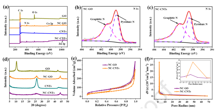 圖3 (a)氧化石墨烯、NC -氧化石墨烯、CNTs和NC-CNTs的XPS譜圖。(b) NC-GO和(c) NCs-CNTs的N 1s XPS峰。(d) x射線衍射模式。(e) NC-GO和(c) NC-CNTs的N