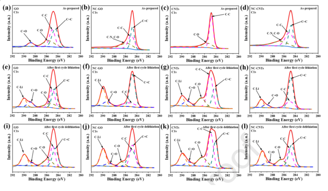 圖6 不同電荷態(tài)氧化石墨烯、碳納米管、碳納米管和碳納米管的XPS譜圖。如準(zhǔn)備:(a) GO;(b) NC-GO;(c)碳納米管;(d) NC-CNTs。第一次循環(huán)鋰化后:(e)氧化石墨烯;(f) NC-GO;(g)碳納米管; (h) NC-CNTs;(i) GO; (j) NC-GO; (k)碳納米管; (l)NC-CNTs。