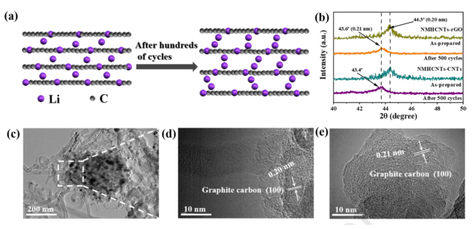 圖7 (a)經(jīng)過(guò)反復(fù)的鋰化和分解過(guò)程后,陽(yáng)極 (NC-GO和NC-CNTs) 衍生CNTs層的擴(kuò)展示意圖。(b) 500循環(huán)前后XRD對(duì)比曲線。(c) CNTs的TEM圖像。NC-CNTs HRTEM圖像。(d)前周期;(e) 500循環(huán)后。