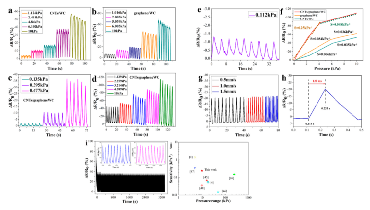 圖 7. (a) CNTs/WC、(b) 石墨烯/WC 和 (c 和 d) CNTs/石墨烯/WC 在不同壓力下的實時電阻響應。 (e) CNTs/石墨烯/WC復合氣凝膠在0.112 kPa壓力下的相對電阻變化。(f) CNTs/WC、石墨烯/WC和CNTs/石墨烯/WC壓力傳感器的靈敏度。 (g) CNTs/graphene/WC-based sensor 對力的響應分別為 0.5、1.0 和 1.5 mm/s。 (h) CNTs/graphene/WC 的響應時間。(i) CNTs/graphene/WC 在1.568 kPa壓力下連續(xù) 800 次壓縮-釋放循環(huán)的穩(wěn)定性能。 (j) 近年來報道的基于氣凝膠的柔性傳感器傳感性能的比較。