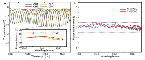 圖2. 90度光混合性能。(a)混合動(dòng)力中四個(gè)輸出端口的測(cè)量傳輸。CH表示輸出通道,該數(shù)字與輸出端口數(shù)字對(duì)應(yīng)。插圖:測(cè)量混合動(dòng)力的相位偏差。(b)測(cè)量混合動(dòng)力的功率失衡。藍(lán)線(紅線)表示輸出通道1和4(通道2和3)之間的功率失衡。