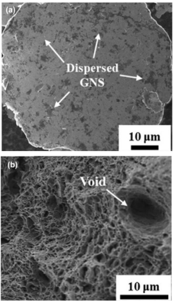 圖2. (a)石墨烯/鋁納米復(fù)合材料的SEM圖像;(b)石墨烯/鋁納米復(fù)合材料中產(chǎn)生的微孔洞的金屬斷面顯微圖。
