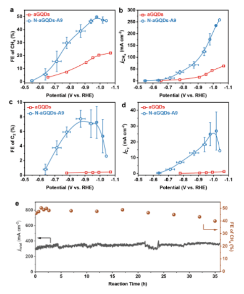 Figure 2. NH2-功能化的aGQD樣品用于CO2電還原的活性和穩(wěn)定性評(píng)估。a) CH4的FE,b) CH4電流密度,c) C2 產(chǎn)物的 FE,以及 d) C2 產(chǎn)物的電流密度。e) N-aGQDs-A9樣品在-0.98 V恒定電位下的穩(wěn)定性測(cè)試。