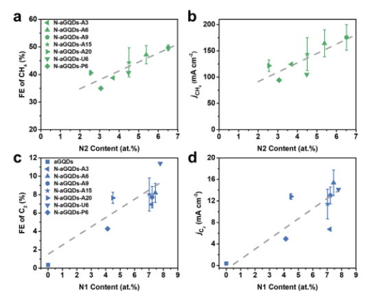 Figure 3.CO2 反應(yīng)活性與 N含量的相關(guān)性。a) CH4 的 FE 和 b) CH4的電流密度對(duì)-NH2 (N2) 含量的依賴(lài)性。c) C2 產(chǎn)物的 FE 和 d) C2 產(chǎn)物的電流密度對(duì)吡啶 N (N1) 含量的依賴(lài)性。