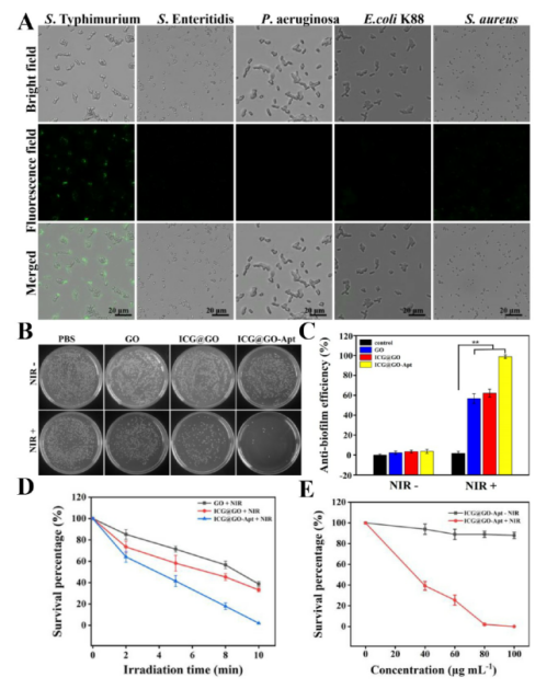 圖 4. Apt結(jié)合的NSs的細菌靶向能力和抗菌素效率的評估。(A) 不同細菌與FAM標記的 Apt (200 nM) 結(jié)合的共聚焦顯微鏡圖像。(B,C) S. Typhimurium 菌落板和相應(yīng)的抗生物膜效率。 (D) NIR 照射不同時間的不同 NSs 的生物膜存活率。 (E)不使用 NIR 或使用 NIR 的不同濃度 ICG@GO-Apt 的生物膜存活百分比。