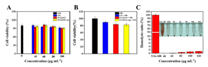 圖 6. NS 的細胞活力和溶血分析。 (A) 用不同劑量的 GO、ICG@GO 和 ICG@GO-Apt NSs 處理的 HEK 293 的生存能力。(B)在NIR 刺激后,HEK 293 與不同 NSs (80 μg m L-1) 孵育的細胞活力。(C) Triton X-100、PBS 和不同濃度 ICG@GO-Apt 的相對溶血率。 插圖是相應(yīng)的照片。