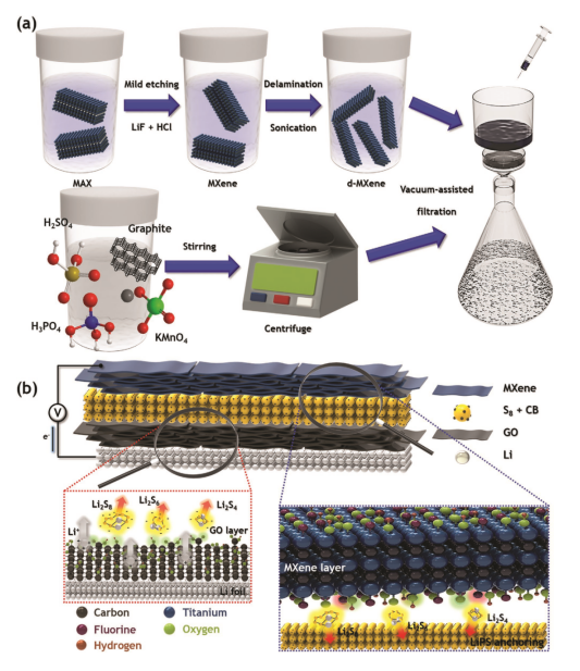 2Tx-MXene和氧化石墨烯 (GO) 多層膜通過利用微/介孔的物理抑制和表面官能團的化學吸收來抑制穿梭效應。Go 和 mxene GO和MXene豐富的表面官能團吸引鋰離子(Li