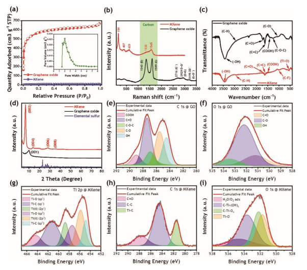 d)MXene、GO 和元素硫的 X 射線衍射圖,e,f)GO的 C 1s 和 O1s XPS 結(jié)果, g-i) MXene 的 Ti 2p、C1s 和 O1s XPS 結(jié)果,解釋了化學鍵。