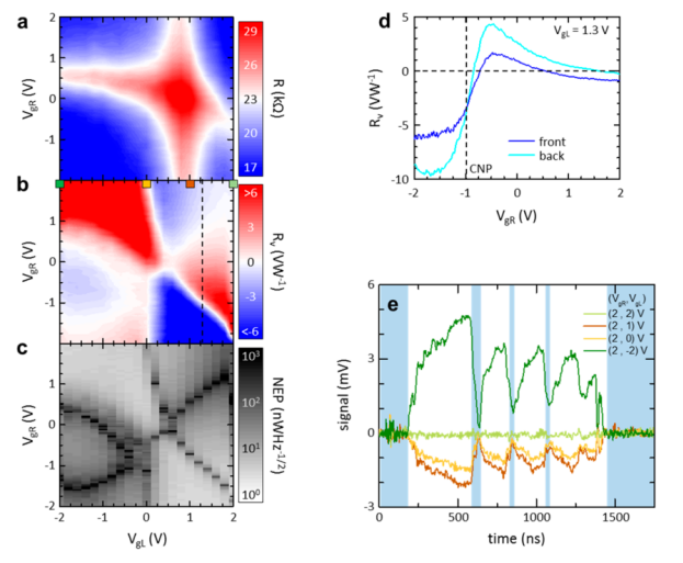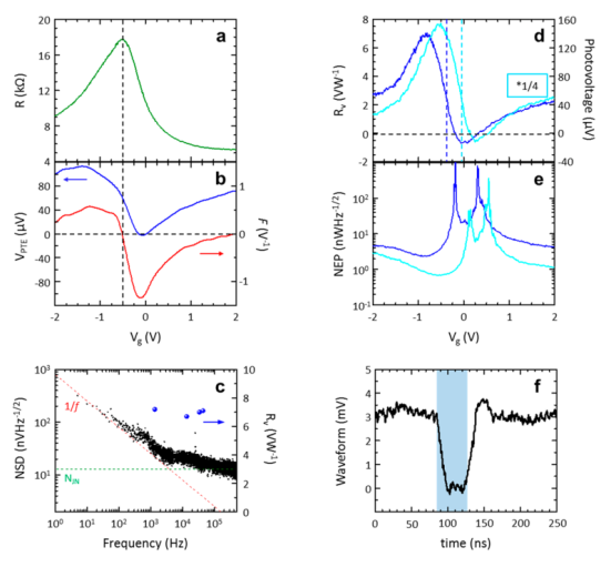 bu)之間的差值獲得,乘以△Te = 1k。Sbg根據(jù)GFET跨導(dǎo)計算,使用莫特方程。Sbu假設(shè)等于Sbg在Vg= 0 V。右縱軸,紅色曲線:場效應(yīng)晶體管因子(F),根據(jù)GFET跨導(dǎo)計算。(c)單位帶寬的噪聲電壓(左縱軸,Vg= 0 V)。(d)空氣側(cè)左縱軸:用1.334kHz的調(diào)制頻率測量的太赫茲響應(yīng)度。雙符號變化與PTE主導(dǎo)的反應(yīng)兼容。右垂直軸:光從正面入射并通過硅透鏡襯底時測得的作為Vg函數(shù)的光電壓。改進(jìn)的光學(xué)耦合將光響應(yīng)提高了一個因子4。 (e)作為Vg函數(shù)的NEP。(f)黑色曲線:在負(fù)微分電阻狀態(tài)下驅(qū)動QCL時記錄的光電壓時間軌跡。從波形中,我們提取出τ~6±0.3 ns。藍(lán)色陰影區(qū)域代表激光發(fā)射關(guān)閉的時間間隔。