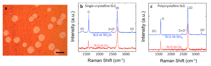 圖 5. (a) 在 Cu 上生長的 SLG 晶粒的代表性光學(xué)圖像,對比度通過在 250 ℃ 下在空氣中加熱 1 分鐘而增強。比例尺 100 μm。 (b) 代表性拉曼光譜,在532 nm處測量在 Cu(藍(lán)色)和SLG在SiO