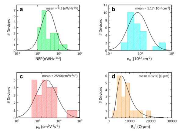 圖 7. (a) NEP的分布。實線代表擬合正態(tài)分布(注意x軸是對數(shù)刻度)。 計算出的平均值和IQR分別為4.3 nWHz