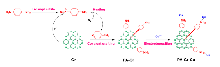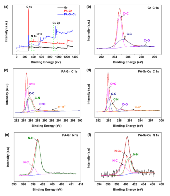 圖6。Gr、PA-Gr和PA-Gr-Cu的測(cè)量掃描;(b) Gr、(c)PA-Gr和(d)PA-Gr-Cu的碳1s光譜;(e) PA-Gr。(f)PA-Gr-Cu的N 1s光譜。
