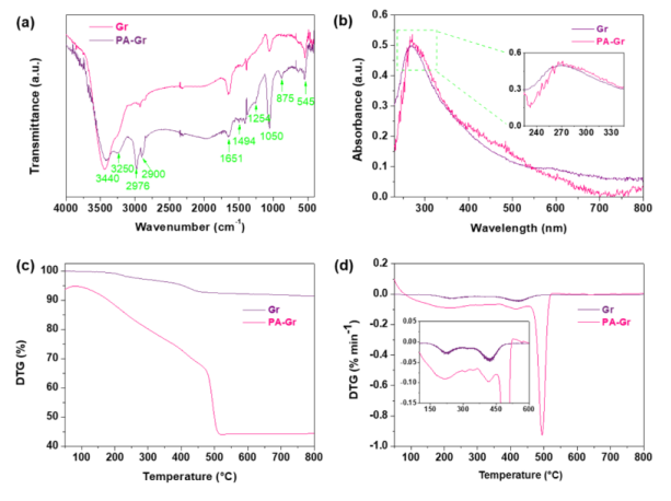 圖2。(a)傅里葉變換紅外光譜,(b)紫外/可見(jiàn)光譜,(c)熱重,和(d)Gr和PA-Gr的相應(yīng)DTG曲線