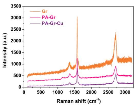 圖3。Gr、PA-Gr和PA-Gr-Cu的拉曼光譜。