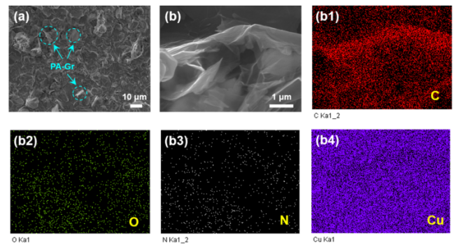 圖4。(a,b)不同尺度下PA-Gr-Cu薄膜表面的掃描電鏡形貌和碳[b(1)]、氧[b(2)]、氮[b(3)]和銅[b(4)]的能譜圖。