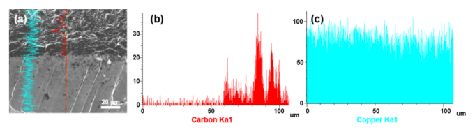 圖5。從45℃視角對(duì)從銅襯底到PA-Gr-Cu膜的橫截面中的界面上的碳和銅進(jìn)行的EDS線掃描:(a)碳和銅的掃描電鏡形貌,(b)碳的EDS信號(hào),以及(C)銅的EDS信號(hào)。