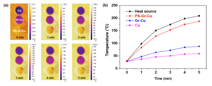 2軌道與石墨烯中的離域大π鍵共軛建立離域共軛體系,以構(gòu)建電子熱傳導(dǎo)路線。然后,石墨烯中豐富的π電子可以不受阻礙地轉(zhuǎn)移到相鄰的銅,從而導(dǎo)致顯著的導(dǎo)熱性。這些結(jié)果表明,用苯胺功能化石墨烯 (PA-Gr-Cu) 沉積的銅基板顯示出506 W m-1k-1 的高熱導(dǎo)率,比原始石墨烯-銅復(fù)合材料的熱導(dǎo)率高 30.8% (Gr-Cu)和44.2%銅 (Cu)。置于熱源上5分鐘內(nèi)從30℃加熱到210℃,PA-Gr-Cu的頂面溫度迅速升高至198℃,而Gr-Cu和Cu的頂面溫度僅緩慢升高至 88℃和 59℃。這項(xiàng)工作表明,在N原子中具有一對(duì)孤電子的苯胺作為中間分子顯示出優(yōu)越性,可連接石墨烯和銅以建立離域共軛系統(tǒng)。 該創(chuàng)新為在石墨烯與銅之間建立共軛結(jié)構(gòu)以構(gòu)建具有顯著導(dǎo)熱性能的電子熱傳導(dǎo)路徑提供了另一種解決方案,并將推動(dòng)石墨烯基金屬基復(fù)合材料的電子熱傳導(dǎo)路徑在散熱應(yīng)用中的研究。