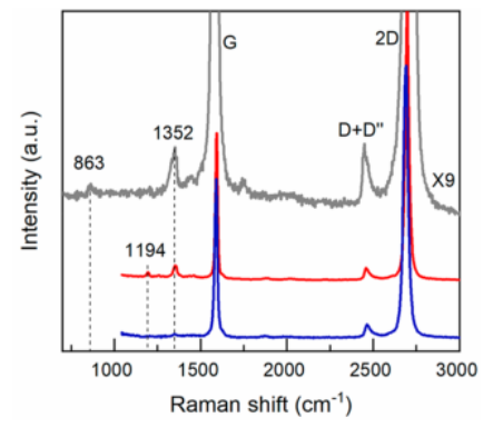 圖 3. 在石墨烯上形成 C-H 吸附化學鍵的光譜證據(jù)。 原始石墨烯的非原位拉曼光譜(藍線),電化學活化石墨烯在 1194 cm