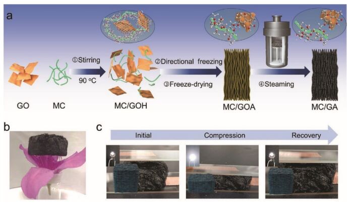 Figure 1. MC/GA的制作工藝及光學圖像。a)描述MC/GA四步制作過程的原理圖;b)由花蕊支撐的MC/GA的光學圖像,顯示其密度低;c) MC/GA的光學圖像,經過一個周期的壓縮和恢復,并伴隨著LED的照明變化。