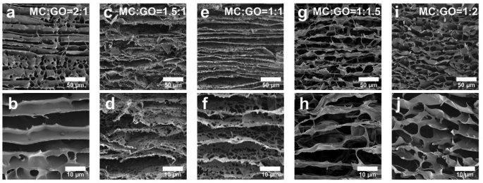 Figure 2. 不同配比的MC/GA的SEM圖像。a,b) MC:GO = 2:1 (MC/GA-2);c,d) MC:GO = 1.5:1 (MC/GA-1.5);e,f) MC:GO = 1:1 (MC/GA-1);MC:GO = 1:15 .5 (MC/GA-0.7);MC:GO = 1:2 (MC/GA-0.5)。