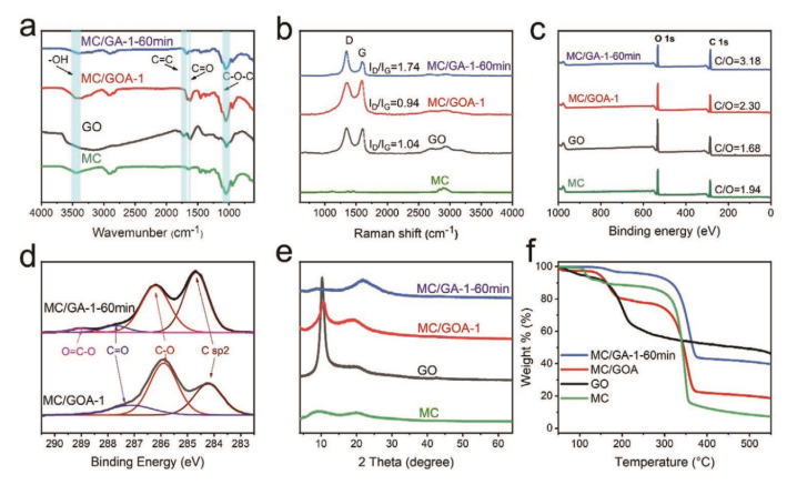 Figure 4. MC、GO、MC/GOA-1和MC/GA-1-60 min的化學微觀結構和熱性能。a) FT-IR, b) Raman, c) XPS, e) GO、MC/GOA-1和MC/GA-1-60 min的XRD譜;d) MC/GOA-1和MC/GA-1-60 min的高分辨率XPS C 1s光譜;f) MC、GO、MC/GOA-1、MC/GA-1-60 min的TG曲線。