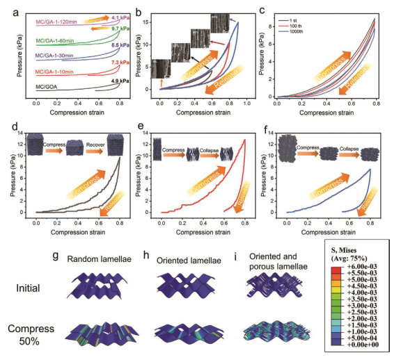 Figure 5. MC/GA-1的各向異性力學和回彈性能。a) MC/GOA-1和MC/GA-1在5 mm/min轉速下的壓縮力學性能;b) MC/ GA -1- 60min的壓縮力學性能隨壓縮應變的變化,插入:MC/ GA -1- 60min在ε= 0%、60%、80%和90%狀態(tài)下的SEM圖像;c) MC/ GA -1- 60min在2 mm/min轉速下的循環(huán)壓縮性能;MC/ GA -1- 60min的壓縮力學性能:d)法向,e)與片層平行,插入:壓縮方向示意圖;f)各向同性MC/GA的壓縮力學性能,插入:壓縮方向示意圖;g)隨機排列、h)有序排列和i)有序多孔片層的氣凝膠壓縮應力有限元分析。